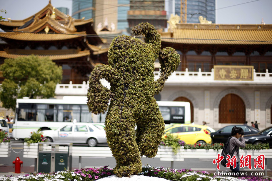 4月29日,上海静安寺前的海宝造型花坛。世博会开幕前,面临“大考”的上海充满喜庆气氛。中新社发 盛佳鹏 摄