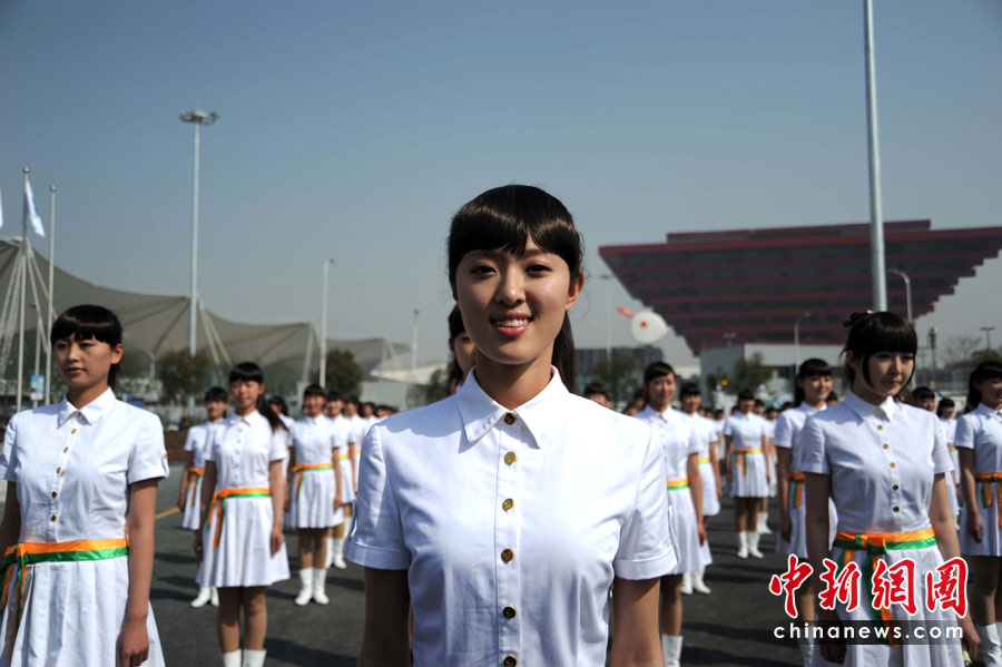 4月30日晚,举世瞩目的上海世博会开幕式将在黄浦江畔世博园区举行。图为上海世博会礼仪小姐正在做最后准备。中新社发 许康平 摄