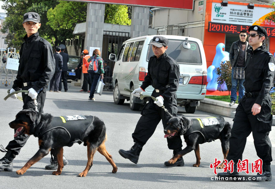 4月30日晚,举世瞩目的上海世博会开幕式将在黄浦江畔世博园区举行。 4月30日上午,上海警察携警犬在世博园周围巡逻。中新社发 贾国荣 摄