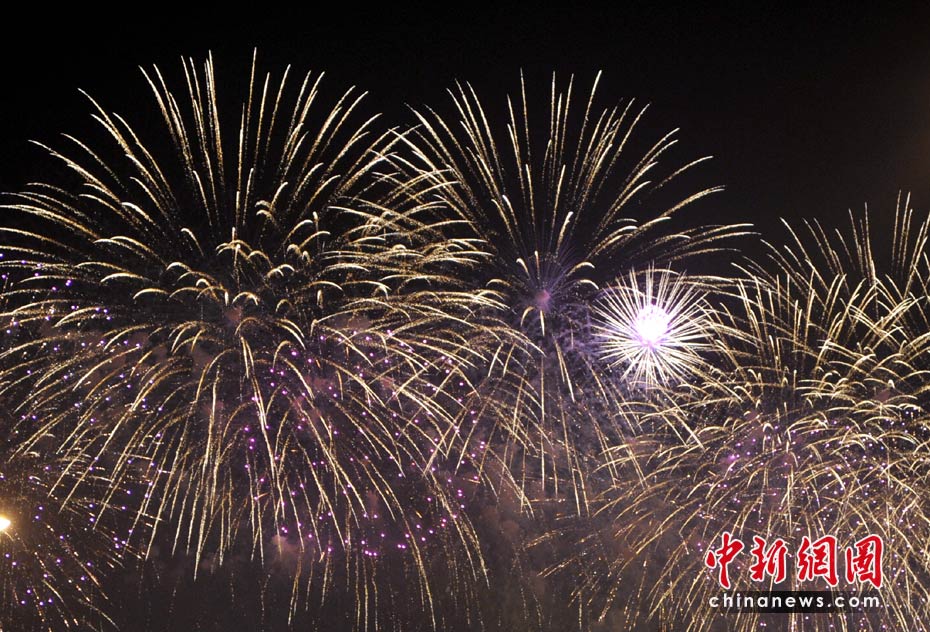 4月30日晚,2010年上海世博会开幕式在上海世博园世博文化中心举行。21时28分,世博会焰火灯光表演开始。黄浦江两岸绵延3.28公里同时奏响火树银花不夜天的华彩世博乐章。中新网记者 王红纲 摄