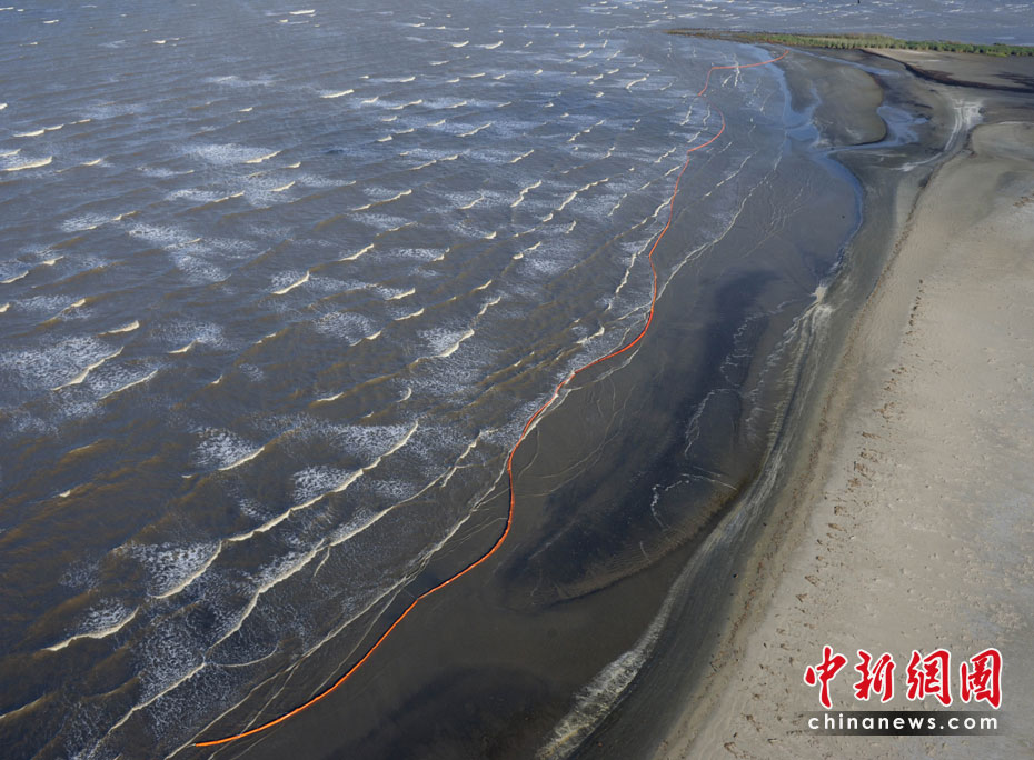 4月30日,在美国路易斯安那州海岸,为阻隔原油扩散而设的护栏带被海风浪冲到岸边。当天,美国总统奥巴马下令调查墨西哥湾石油钻井平台爆炸事件,以避免将来类似事件再次发生。平台爆炸沉没后泄漏的原油当天已漂至美国沿岸。图片来源:中国新闻网