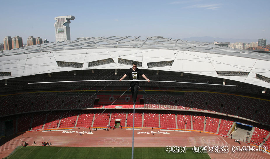 4月29日,有高空王子之称的新疆小伙阿迪力在鸟巢上空成功试演达瓦孜(高空走钢丝)。5月3日起,他将在北京国家体育场(鸟巢)顶棚上搭建的小屋生存60天,其间每天将进行约5个小时的高空走钢丝表演。 图片来源:中国新闻网>>点击观看详细内容