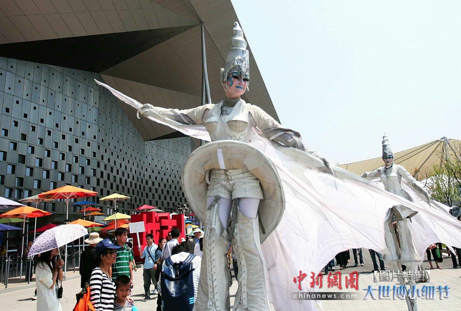 5月1日,上海世博会正式开园,当日有20万人次的游客参观了世博园。世博首日,许许多多的小细节都带给人一种全新的体验。图为荷兰演员在上海世博园主题馆前表演长脚舞。中新社发 袁云 摄