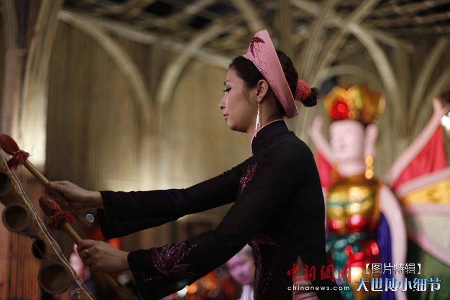 5月1日,上海世博会正式开园,当日有20万人次的游客参观了世博园。世博首日,许许多多的小细节都带给人一种全新的体验。图为越南馆为入馆参观的来宾演奏独特的竹制乐器。中新社发 盛佳鹏 摄