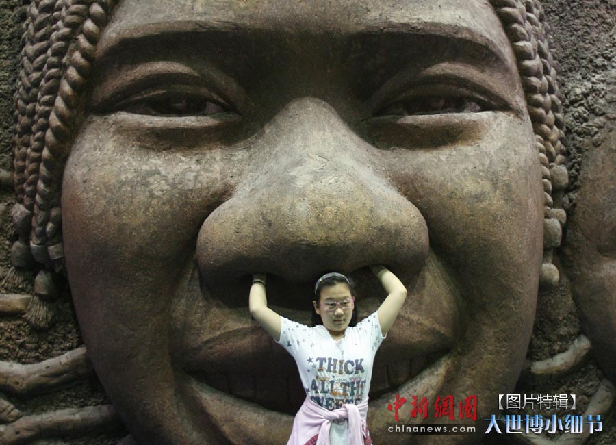 5月1日,上海世博会正式开园,当日有20万人次的游客参观了世博园。世博首日,许许多多的小细节都带给人一种全新的体验。图为一个小女孩在上海世博会非洲联合馆的笑脸墙”前留影。中新社发 苏丹 摄