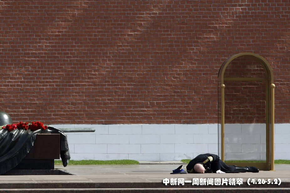 29日(周四),在克里姆林宫,一名俄罗斯士兵被高温击倒。