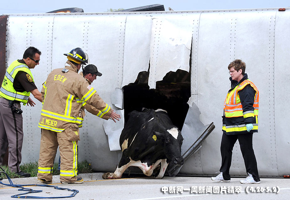 29日(周四),一辆运送奶牛的卡车在威斯康星洲公路上发生事故。