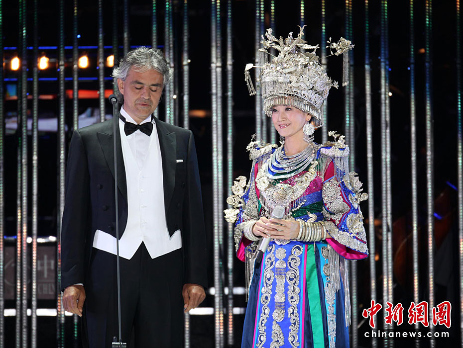 图为宋祖英与意大利歌唱家安德烈•波切利演唱“康定情歌”。王保胜 摄