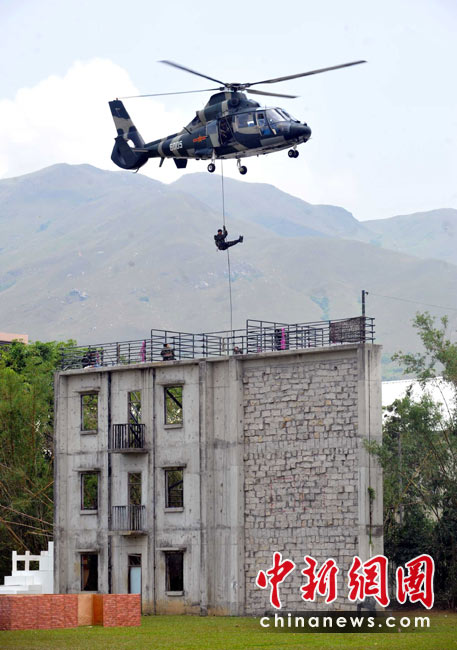 为庆祝“五一”国际劳动节,进一步增进与香港社会各界相互沟通与交流,中国人民解放军驻香港部队5月2日开放了石岗军营。图为驻港部队反恐突击和陆空协同救援演练表演。 中新社发 邓庆乐 摄