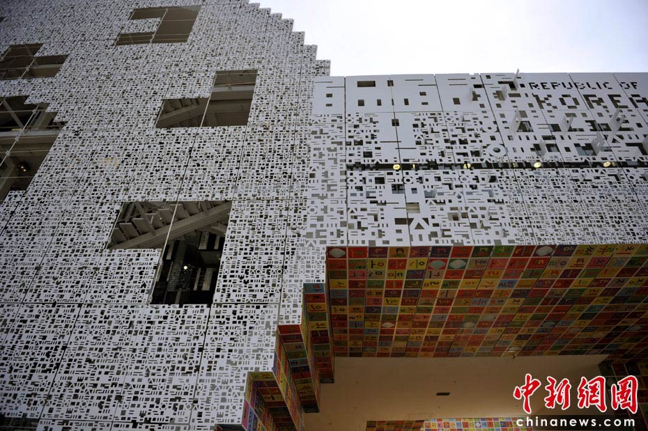 韩国馆是由韩文来“建造”的,远观展馆,由几个硕大的韩文字母连接而成;近看外墙,则为无数凹凸有致的韩文字母。中新网记者 王红纲 摄