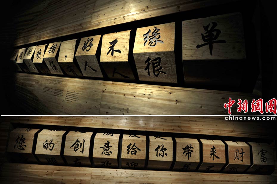 互动体验游戏——游客每拉一下摇杆,会使墙上的木制滚动机滚动,滚动机是由各种汉字组成,每次都会出现一句诸如“您的创意给您带来财富”这样的吉利话,很讨游客的欢心。中新网记者 王红纲 摄