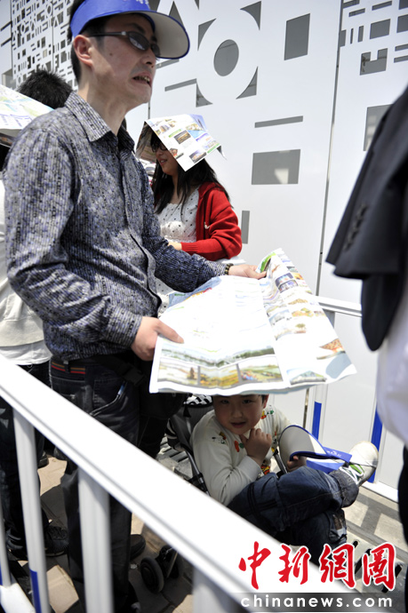 友情提示:韩国馆为热门场馆,参观游客较多,排队时间约为2小时,请做好心理准备。图为韩国馆外的排队者中,一个父亲为儿子遮阳,小家伙很惬意,父亲晒的呲牙咧嘴。中新网记者 王红纲 摄