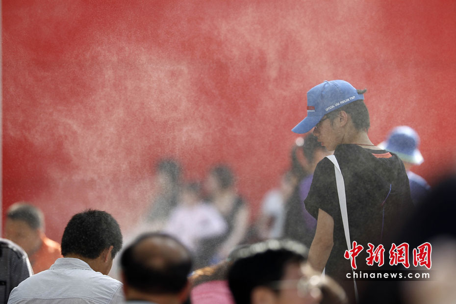 2010年5月2日,上海世博园区启动各项控温降温设施应对高温。图为游客休息区内启动喷雾降温系统。中新社记者 盛佳鹏 摄