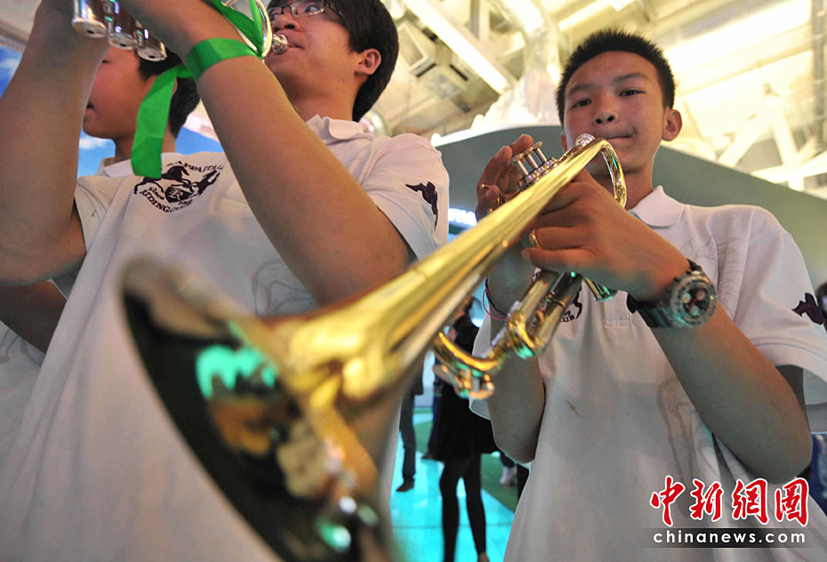 5月2日清晨,来自玉树地震灾区结古镇的藏族小乐手巴东珠,含着姐姐在地震中不幸遇难的悲痛心情,与小白杨中学生管弦乐团来到上海世博会,为中国青海馆观众献上一曲《在那遥远的地方》。他悲欢交融的情怀和演艺,感动全场。巴东珠之前还是青海省人民医院为地震伤员做藏语翻译的志愿者。中新社记者 贾国荣 摄