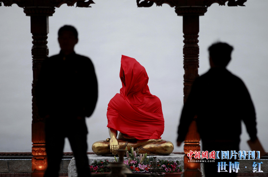 红色象征着热量与活力,红色也象征着兴奋与激情,在世博园区内游览,总会有一抹浓艳的红色闯入到记者镜头之中,让世博变得更加火辣。图为尼泊尔馆的佛像。中新社记者 盛佳鹏 摄