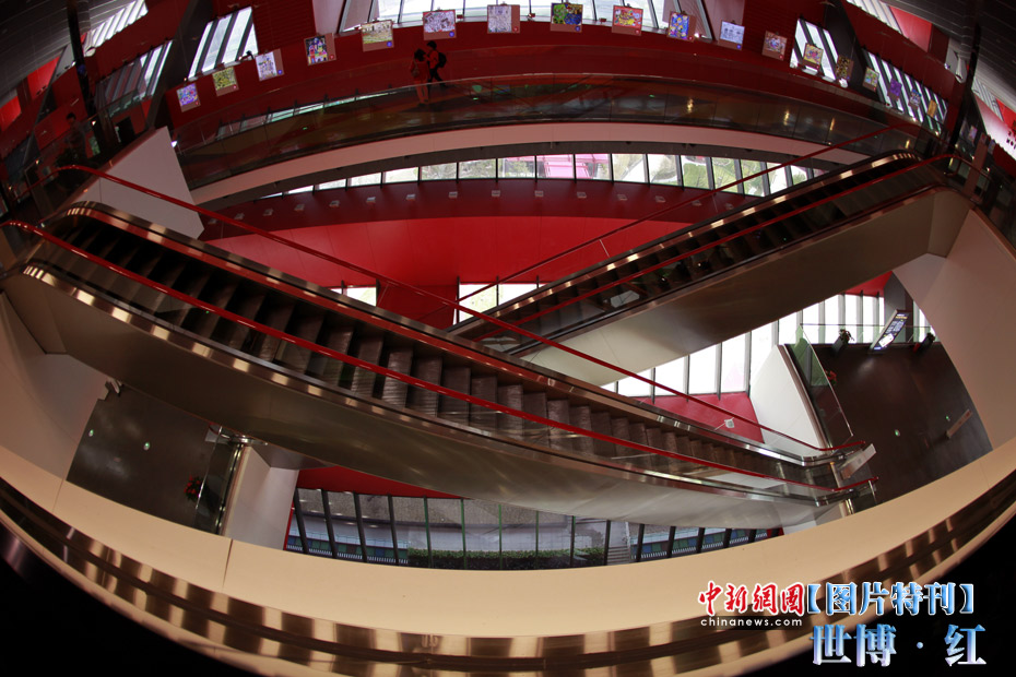 红色象征着热量与活力,红色也象征着兴奋与激情,在世博园区内游览,总会有一抹浓艳的红色闯入到记者镜头之中,让世博变得更加火辣。图为中国馆的扶梯。中新社记者 盛佳鹏 摄