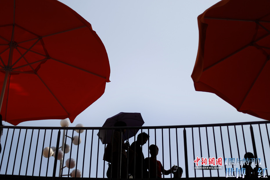 红色象征着热量与活力,红色也象征着兴奋与激情,在世博园区内游览,总会有一抹浓艳的红色闯入到记者镜头之中,让世博变得更加火辣。图为红伞下的游客。中新社记者 盛佳鹏 摄