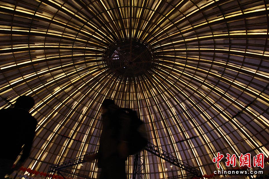 5月2日,上海世博会是第一个正式提出“低碳世博”理念的世博会,围绕着这样的理念,上海世博园区内的低碳元素比比皆是。图为印度馆内竹制的世界最大穹顶,这个竹制穹顶上方是小型风力发电装置和太阳能电池板,为整个场馆提供绿色清洁能源。中新社发 汤彦俊 摄