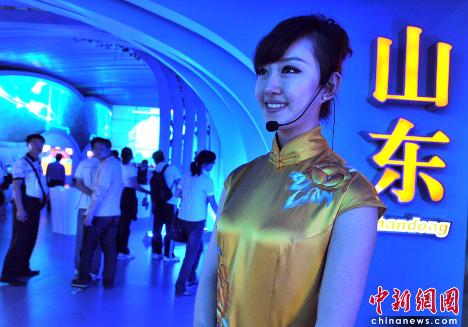 5月3日,上海世博会中国山东馆一位礼仪小姐始终笑容可掬,许多参观者都喜欢与外秀内慧的她拍一张留影照。当一对夫妇推着婴儿车经过时,她迅速上前帮助抬下阶梯。她因而享有全场最善解人意的礼仪小姐美称。中新社发 贾国荣 摄