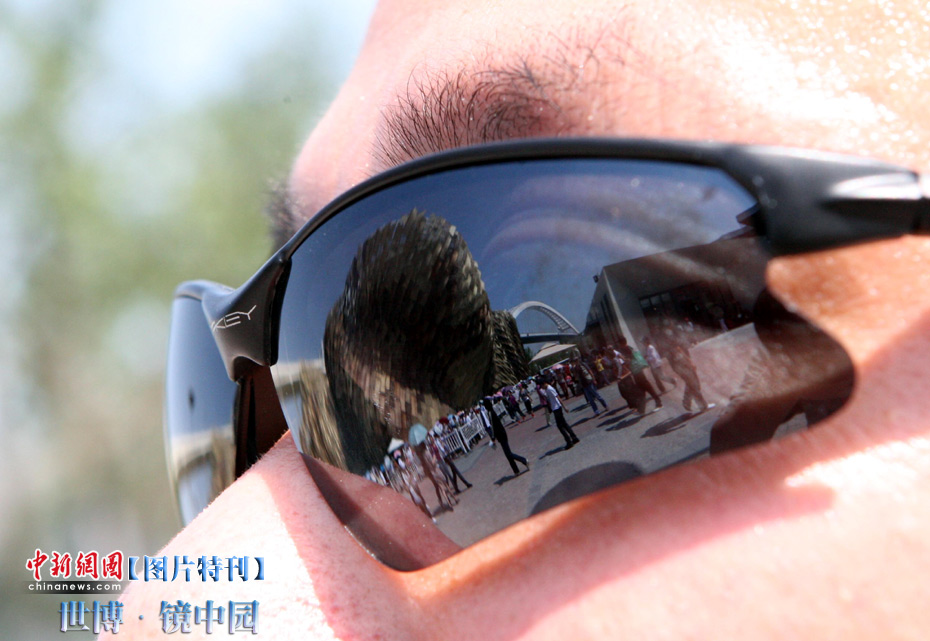 世博园开园3天,天气一直晴热,不少游客带起墨镜来遮挡刺目的阳光,从镜片的折射中看世博园,别有一番趣味。中新社记者 汤彦俊摄