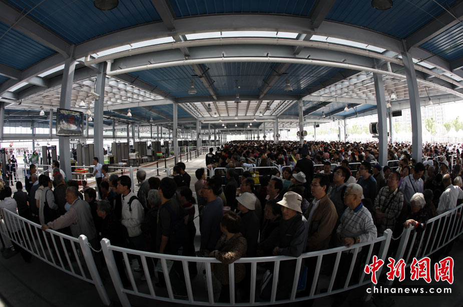 上海世博会4日迎来首个平日票的参观客潮,图为世博园区7号门入口外,还不到开园时间,已经有大批游客排队等候。中新社记者 盛佳鹏摄
