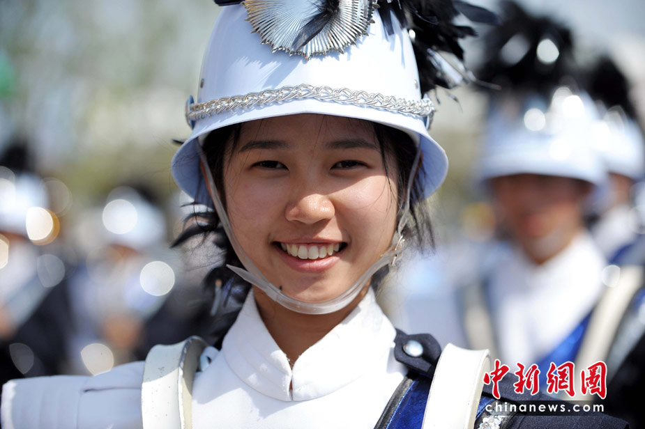 来自泰国南邦甘拉雅尼步操乐团的美少女,在上海世博会园区举行的“欢乐盛装大巡游”中引人注目。中新社发 陈文 摄