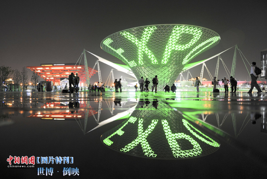世博园庆典广场上,积水倒映着美丽的世博轴。中新社记者 廖攀 摄