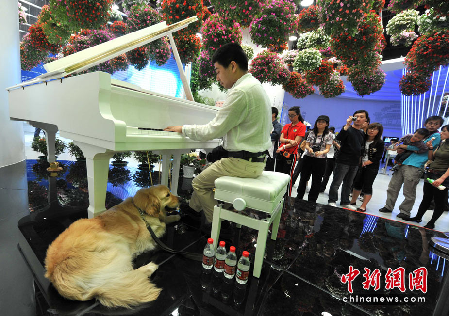 5月4日是上海世博会第四天,盲人钢琴家孙岩在生命阳光馆专设区域为众多残疾人和观众演奏,导盲犬静卧在他的脚边,这是世博会历史上第一次为残疾人设馆。孙岩2005年获得“日本横滨第一届国际残疾人钢琴比赛”金奖,他是中央音乐学院有史以来第一位盲人大学生和研究生。他的倾情演奏感动全场,掌声连连。中新社发 贾国荣 摄