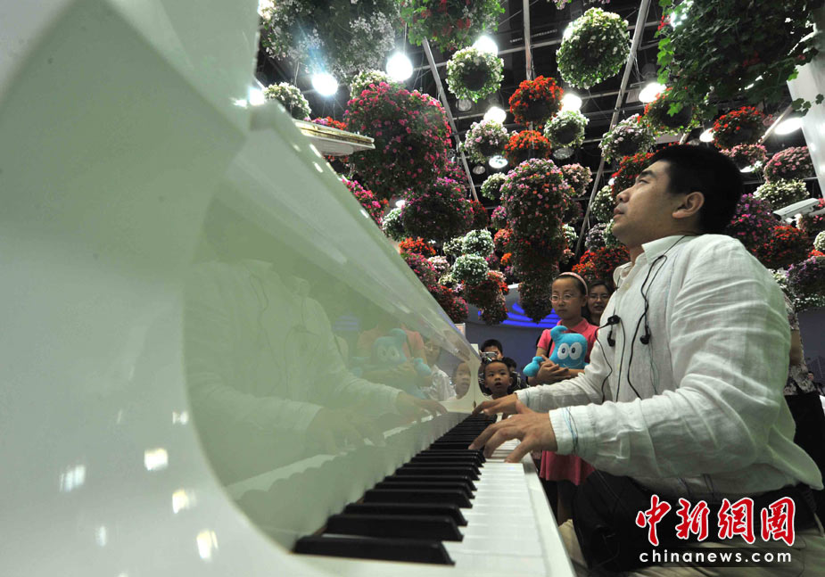 5月4日是上海世博会第四天,盲人钢琴家孙岩在生命阳光馆专设区域为众多残疾人和观众演奏,导盲犬静卧在他的脚边,这是世博会历史上第一次为残疾人设馆。孙岩2005年获得“日本横滨第一届国际残疾人钢琴比赛”金奖,他是中央音乐学院有史以来第一位盲人大学生和研究生。他的倾情演奏感动全场,掌声连连。中新社发 贾国荣 摄