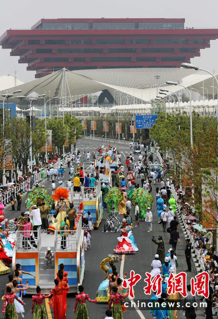 5月4日,世博会北京周花车巡游队伍向中国馆行进。当日,世博会北京周开幕。 中新社发 苏丹 摄