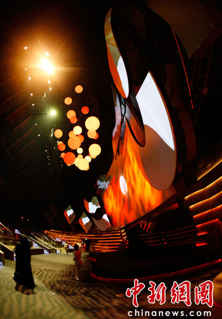 2010年5月4日,上海世博园区迎来首个平日票的参观客潮。图为准备好迎接游客的阿联酋馆的影院。中新社发 盛佳鹏 摄