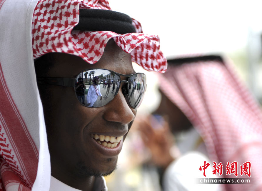 5月4日,上海世博园沙特馆的工作人员欢乐接待游客。中新社发 廖攀 摄