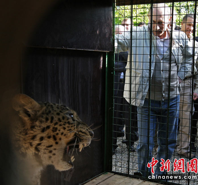 近日,俄罗斯总理普京来到2014年冬奥会举办地索契一家动物园,观看一头用东北虎换来的波斯豹。普京饶有兴致地观察了一会儿后,对这头刚刚到来、还有些认生的豹说:“别害怕,跑起来”,还向它做了个飞吻。此次从伊朗引进波斯母豹,是希望与本地的土库曼尼斯坦公豹交配,以挽救这一濒临灭绝的物种。