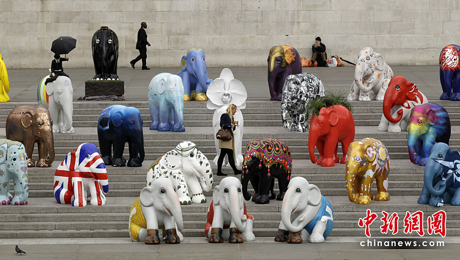 5月4日,2010年伦敦大象游行活动当日在特拉法尔加广场启动。260个真象大小的彩绘雕塑将在伦敦各处展出,并将于6月30日拍卖为慈善组织筹款。图片来源:中国新闻网