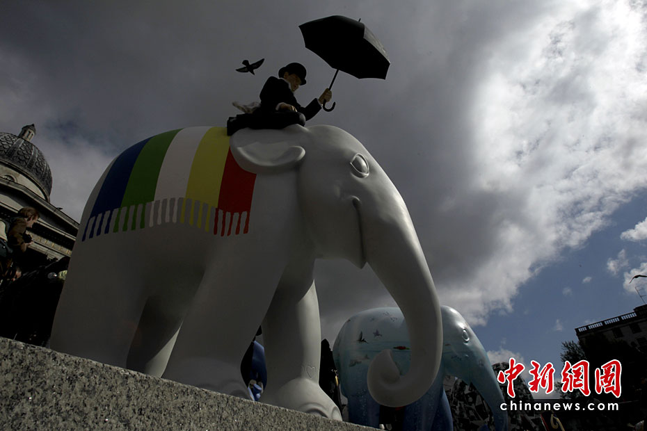 5月4日,2010年伦敦大象游行活动当日在特拉法尔加广场启动。260个真象大小的彩绘雕塑将在伦敦各处展出,并将于6月30日拍卖为慈善组织筹款。图片来源:中国新闻网