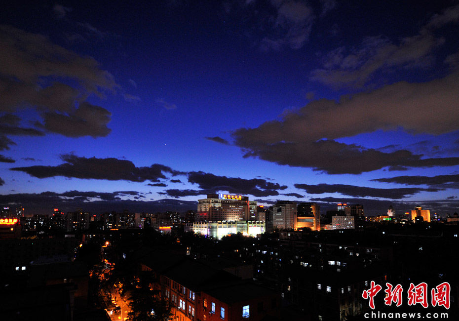 5月5日立夏,京城降雨今晨刚刚结束,雾气伺机又起。傍晚时分,随着四级北风的到来,京城天气逐渐转晴,雾气慢慢消散天空彤云密布夜色瑰丽。中新网记者 金硕 摄