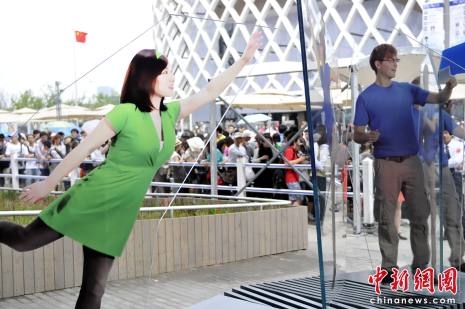 图为德国馆的两个虚拟讲解员——德国青年“严思”和中国女孩“燕燕”。中新网记者 王红纲 摄