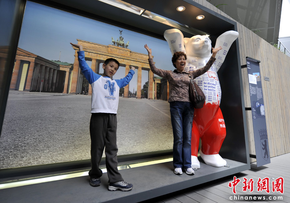游客在图片墙前模仿“柏林熊”的样子拍照。中新网记者 王红纲 摄