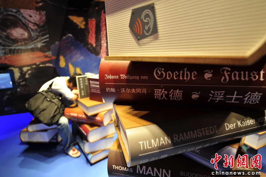 德国文化的展示区,桌面的读者可不是睡着了,那本书是可以发声的,他也许是“沉浸”在故事中了。中新网记者 王红纲 摄