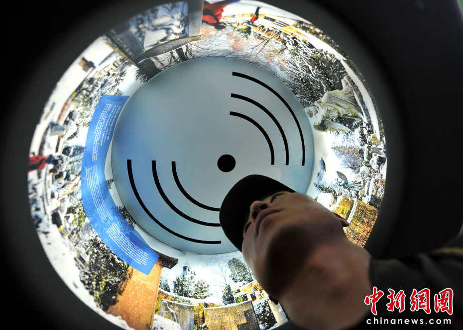360度环绕视听体验,像个灯罩一样,游客可以把头伸进去,声音效果的确不错。中新网记者 王红纲 摄