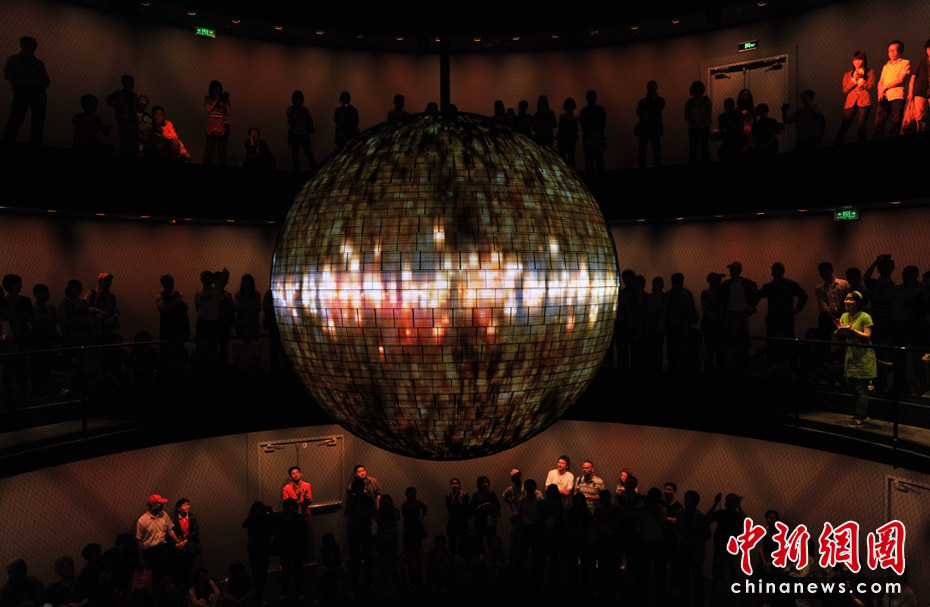 德国馆的高潮就是它的最后部分“动力之源”。可以容纳600人的动力之源大厅圆形环廊是一个圆锥形空间,中间悬挂着一个重达1.5吨、直径达3米的巨大金属球,四周则有一圈供游客驻足的走廊。黑漆漆的大厅里,两个虚拟主持人邀请观众同时大声呐喊。随着呐喊声的加大,动力球慢慢摆动起来,声音越大摆动幅度越大,甚至绕圈飞行。圆球表面40万根发光的LED管,逐渐闪现出德国人对未来城市生活的畅想画面。这是一场7分钟的互动体验。在这里观众才是主角。中新网记者 王红纲 摄