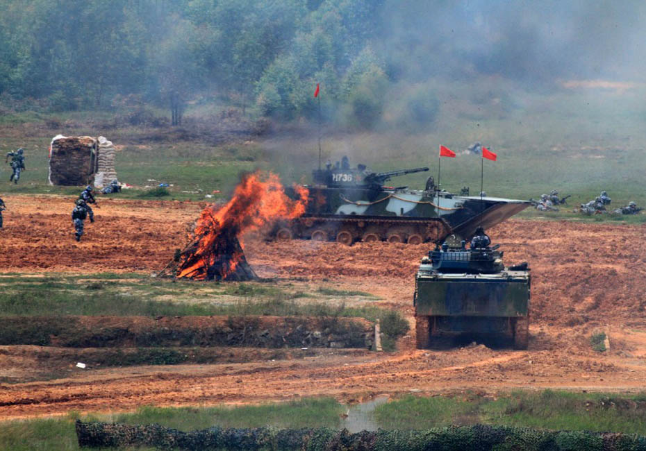 海军陆战队在训练场进行登陆作战实兵实弹演练。图片来源:新华网 查春明摄