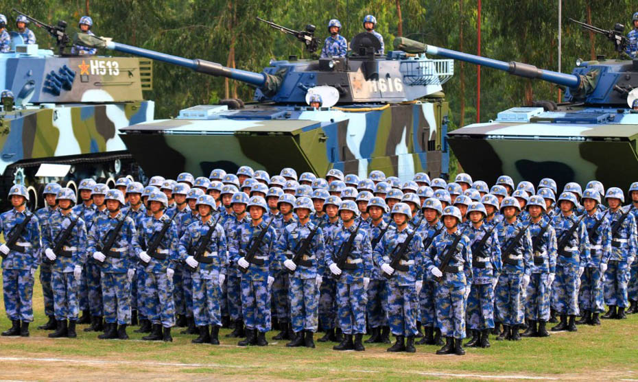 海军陆战队员和新型装备接受检阅。图片来源:新华网 查春明摄
