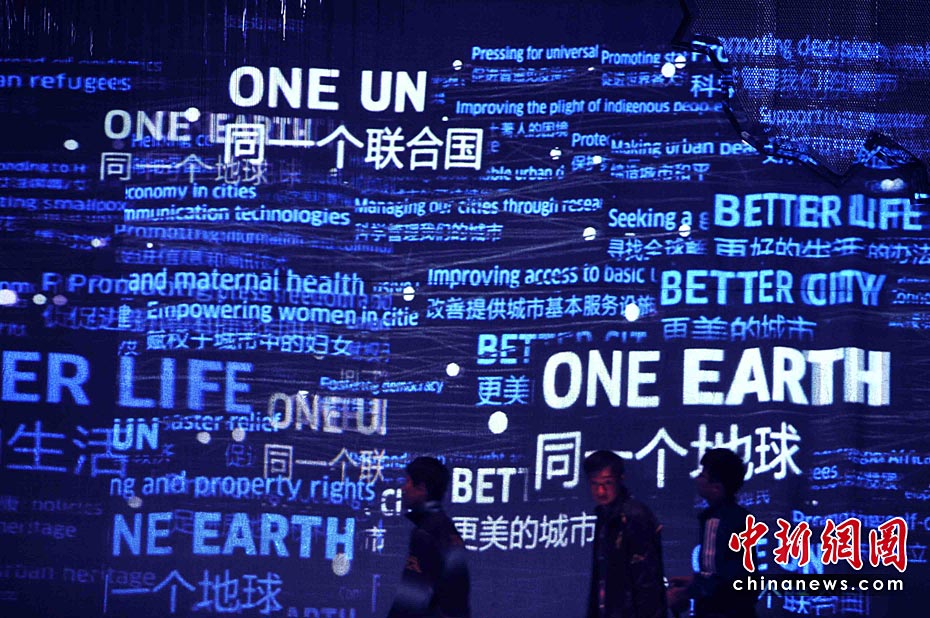 一所蓝色的简朴平房,在5月开园的上海世博会大道边上,极不显眼。但是,联合国联合馆的鲜明会标,特别吸引人。这个展馆集中了世界卫生组织、世界银行和联合国的儿童基金会、粮农组织、教科文组织等22个机构。图片来源:中国新闻网 贾国荣 摄