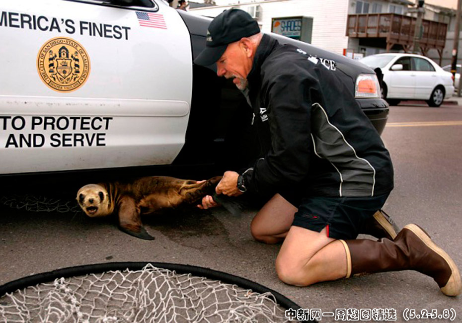 5月5日,在加利福尼亚州,动物护理专家罗宾森把一头小海豹从圣地亚哥警车下拖出。小海豹之前在另一辆车下被发现,看到警察要捉它就躲到了这辆警车下。图片来源:中国新闻网>>点击观看详细内容