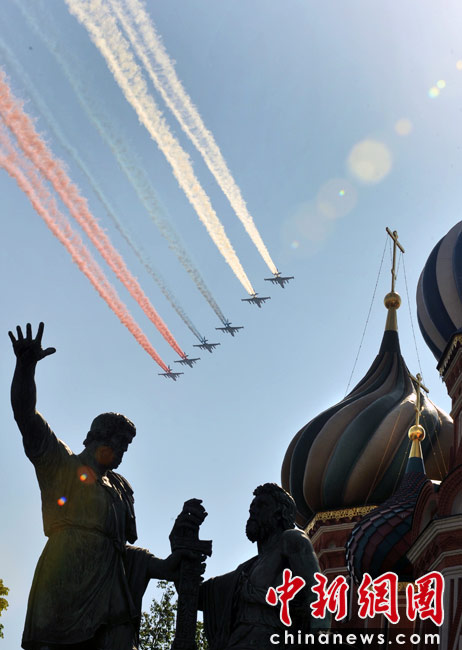 5月9日,俄罗斯在莫斯科红场举行盛大的阅兵式,庆祝卫国战争胜利65周年。莫斯科时间5月9日上午10点(北京时间9日下午2点)许,阅兵式正式开始。图为空中梯队飞越红场上空。