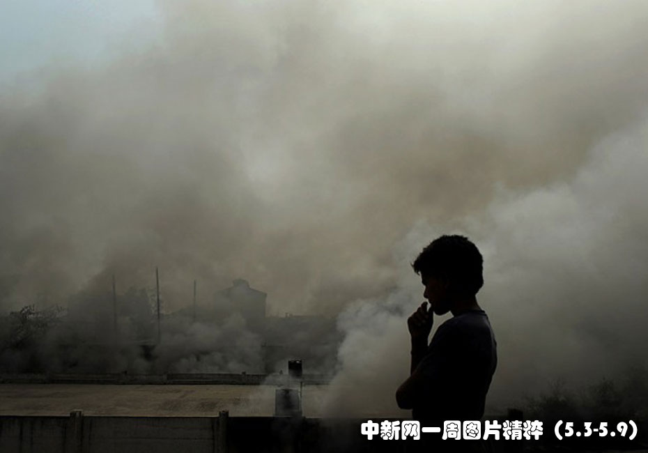 5月5日周三,在新德里,一名男孩看着冒烟的仓库。目前还没有伤亡报告。