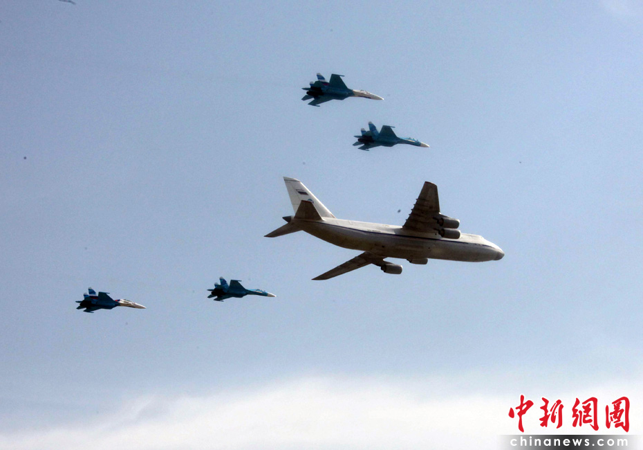5月9日,俄罗斯在莫斯科红场举行盛大的阅兵式,庆祝卫国战争胜利65周年。莫斯科时间5月9日上午10点(北京时间9日下午2点)许,阅兵式正式开始。图为空中梯队穿越红场上空接受检阅。张朔 摄