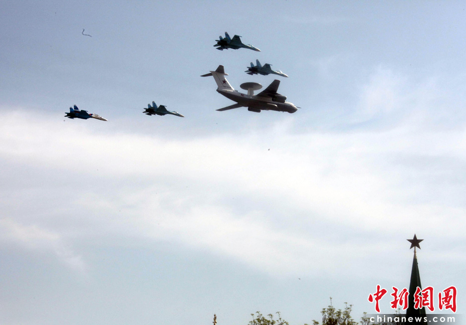 5月9日,俄罗斯在莫斯科红场举行盛大的阅兵式,庆祝卫国战争胜利65周年。莫斯科时间5月9日上午10点(北京时间9日下午2点)许,阅兵式正式开始。2--图为空中梯队穿越红场上空接受检阅。张朔 摄