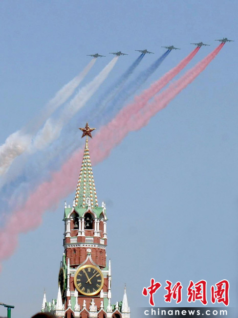 5月9日,俄罗斯在莫斯科红场举行盛大的阅兵式,庆祝卫国战争胜利65周年。莫斯科时间5月9日上午10点(北京时间9日下午2点)许,阅兵式正式开始。6架苏-25强击机在红场上空喷出象征俄罗斯国旗白、蓝、红三色的烟雾。中新社发 田冰 摄